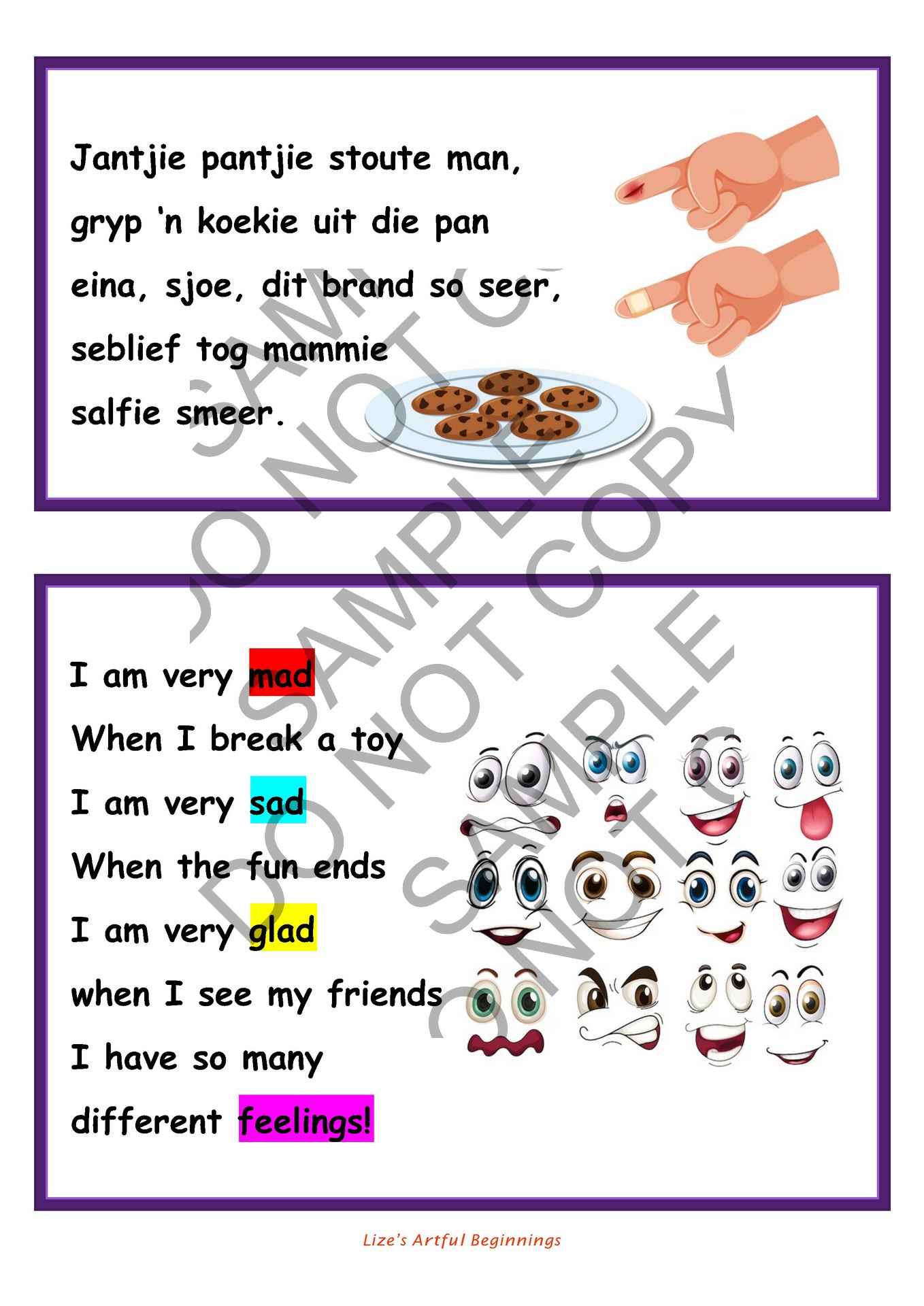 Tema bestaan uit A4 kleur voorblad, inkleur, skeur en plak, verf en rympie bladsye.