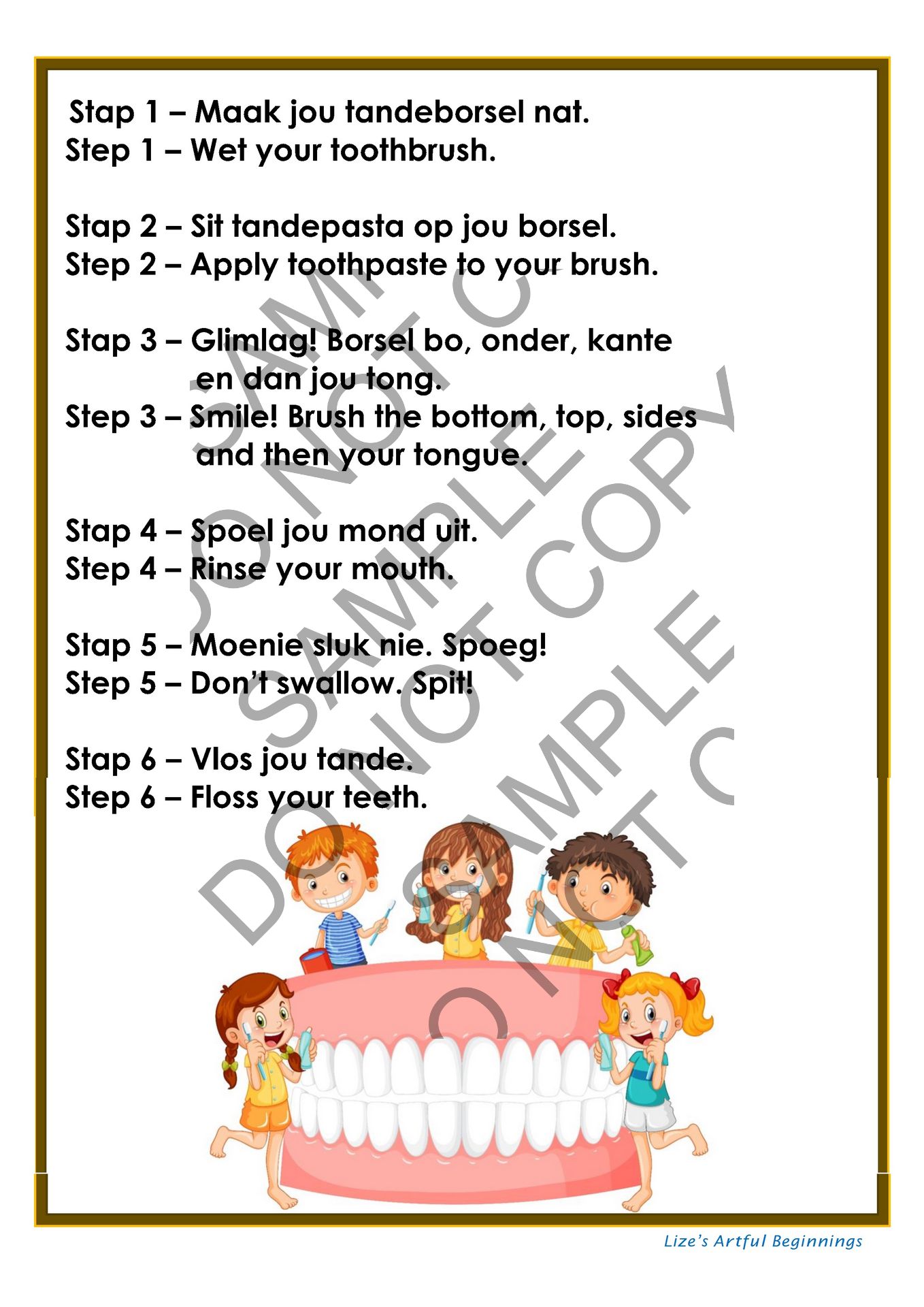 Voorblad, inkleur, skeur en plak, verf , stap vir stap tande borsel en rympie.